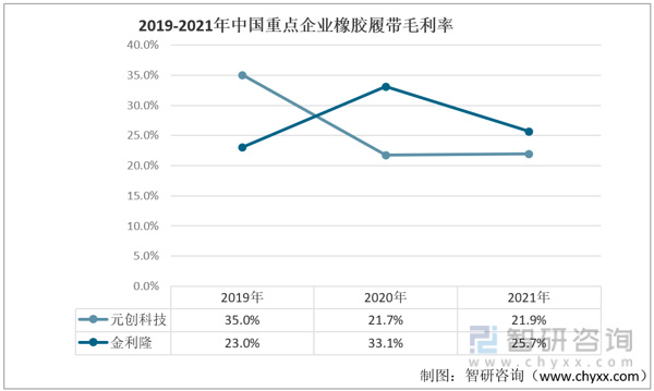 对比元创科技和金利隆的橡胶履带业务的毛利率情况,2019-2021年元创科技橡胶履带业务的毛利率呈现先下降后上涨的趋势,而金利隆近年该业务的毛利率呈现先上涨后下降的趋势;2021年,元创科技、金利隆各自的毛利率分别为21.9%以及25.7%。