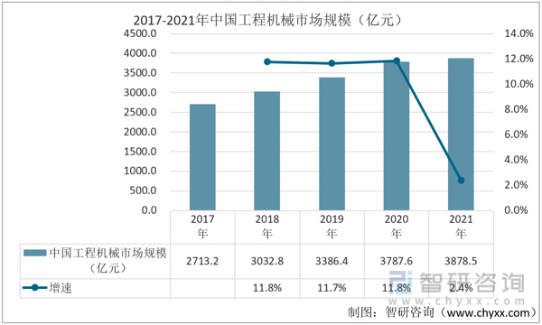 从需求来源来看,工程机械行业的需求增长主要由基础设施建设与房地产业决定,其需求场景包括了铁路、公路、市政建设、房地产开发、矿山开采、制造业基础设施建设等。由数据可知,中国工程机械市场规模将由2017年的2713.2亿元增长至2021年的3878.5亿元。