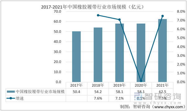 过多年的创新发展,国内橡胶履带的性能已达到国际先进水平,国际影响力逐步提高,出口市场需求旺盛,使我国成为橡胶履带生产销售大国;近年来,我国橡胶履带市场规模稳步上涨,2021年市场规模达到62.5亿元。