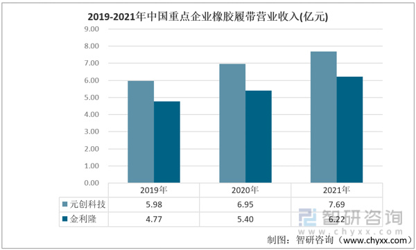 目前,橡胶履带已广泛应用于农业机械、工程机械、运输机械、雪地机械、和军用装备等诸多机械领域,能够扩大机械、车辆的作业范围,改善机械的行驶性能,对实现市政基础建设机械化,以及农田、沙漠、沼泽地等松软地面机械作业和运输具有重要意义;从2019-2021年元创科技以及金利隆的橡胶履带营收来看,两家企业橡胶履带的营业收入一直呈现稳步上涨的趋势,2021年该业务各自的营收分别为7.69亿元以及6.22亿元。