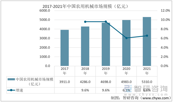 农业是支撑国民经济建设与发展的基础产业,而农业机械化是建设现代农业的重要基础,也是实现农业现代化的重要标志与内容。近年来,在国家政策补贴及机械化率稳步增长等因素的推动下,农用机械市场规模不断增长;2021年我国农业机械行业市场规模为5310亿元,同比增长6.6%。