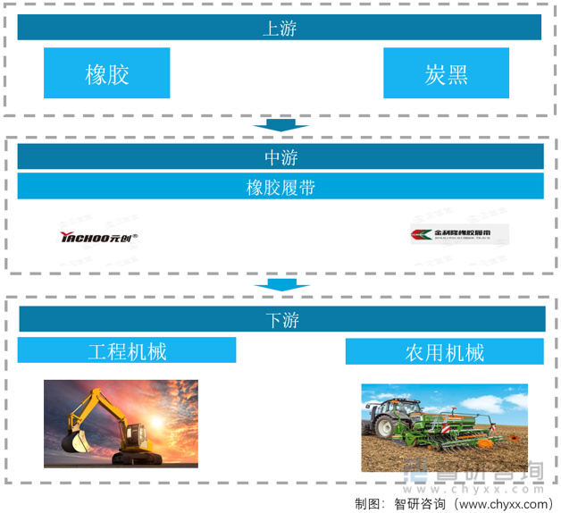从产业链角度来看,橡胶履带的上游原材料主要包括橡胶、炭黑等;橡胶履带下游主要包括工程机械以及农用机械。