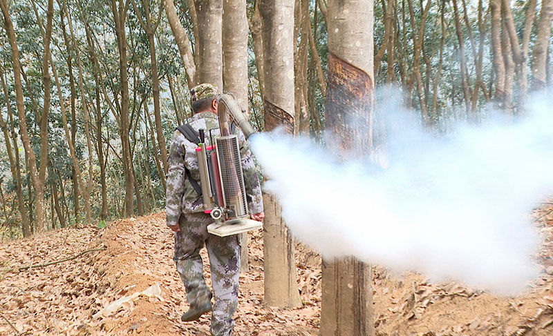 在该公司四队,职工正在对喷粉机进行维护、检查,准备春防物资。在橡胶园里,只见作业人员正在装粉、喷粉,处处可见他们忙碌的身影,喷粉机轰隆隆的声音从远处传来,烟雾四起弥漫胶园。职工罗朝瑞说:“这个机器功能好,功率也大,过去的机器一天早上才喷一百亩左右,现在这个机器一天早上基本上可以喷五百亩左右。”