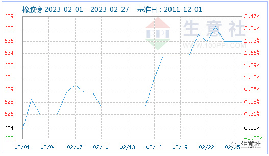 据生意社监测,2月份橡胶产品涨跌互现,合成橡胶价格上涨、天然橡胶价格走跌,橡胶市场行情整体小幅上行,截至2023年2月26日生意社橡胶指数636点,较2月初的624点上涨了1.92%。