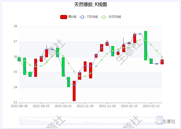需求面,橡胶行业下游开工大幅提升、橡胶需求面持续好转。截至2023年2月24日,山东地区轮胎企业全钢胎开工负荷为6.8成、半钢胎开工负荷在7.4成,分别较2月初的2.6成、3.4成大幅走高。随着轮胎企业开工走高,前期原料库存消耗,逐步对原料补库。下游需求改善,对橡胶行业形成托底效应。天然橡胶:截至2月25日天然橡胶价格较月初下跌了4.20%,主要受天然橡胶社会库存压力影响。据了解,截至2023年2月19日中国天然橡胶社会库存128.1万吨,较1月底的123.7万吨增加4.4万吨。当前全球天然橡胶产量已处于年度低谷期,虽然目前以消耗年前备下的库存为主,采购新单量少,但是我国下游乳胶制品企业的需求已经开始逐步恢复,缓解了天然橡胶累库速度,在一定程度上抑制了天然橡胶下跌幅度。