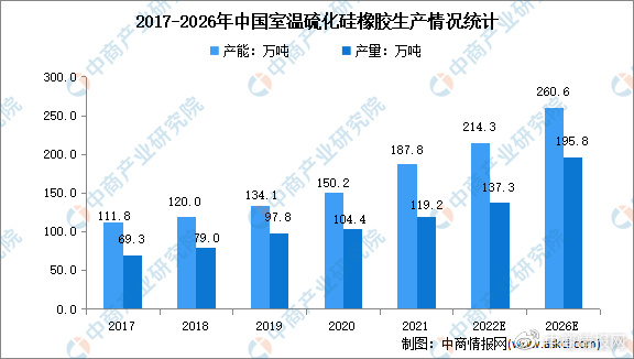 中商情报网讯:室温硫化硅橡胶是一种分子量较低的直链状的高分子聚硅氧烷,通过添加补强剂、填料、交联剂、催化剂及其他助剂混配而成。根据SAGSI的统计,2021年我国室温硫化硅橡胶总产能为187.80万吨/年,同比增长25.00%;产量约为119.20万吨,同比增长14.20%。根据SAGSI预计,2026年我国室温硫化硅橡胶产能将达到260.60万吨/年,产量为195.80万吨。