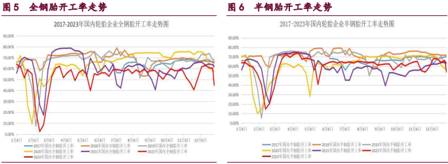 2023 年 1 月 6 日当周,山东地区轮胎企业全钢胎开工负荷为44.3%,较上周小幅回落 0.40 个百分点,较去年同期大幅下滑 7.22 个百分点。国内轮胎企业半钢胎开工负荷为 51.50%,较上周小幅回落 2.40 个百分点,较去年同期大幅回落 8.97 个百分点。随着国内疫情防控政策优化叠加春节假期影响,预计轮胎行业开工率面临阶段性回落。