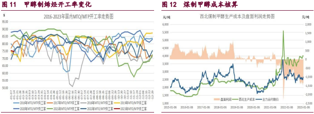 步入 2023 年 1 月以来,国内甲醇传统需求和烯烃需求依然偏弱。截止2023年 1 月 6 日当周,国内甲醛开工率维持在 20.36%,月环比小幅回落5.66%。同时二甲醚方面,开工率维持在 20.28%,月环比小幅回落1.63%。醋酸开工率维持在 87.03%,月环比小幅回升 2.00%。MTBE 开工率维持在51.32%,月环比小幅回落 1.02%。除了传统消费领域改善有限外,作为甲醇下游最大需求的烯烃需求依然表现偏弱。截止 2023 年 1 月 2 日当周,国内MTO/MTP 平均开工率维持 74.56%,月环比小幅回落 5.02%。目前甲醇制烯烃期货盘面利润为-186元/吨,月环比小幅下降 439 元/吨。
