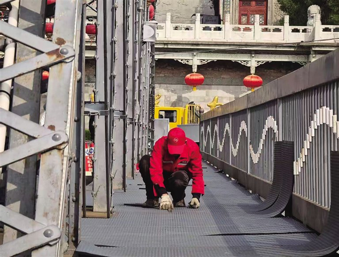 兰州市市政工程服务中心桥梁设施养护所养护股股长王珩介绍,中山桥人行道橡胶板最初于2010年提升改造时进行过更换,十余年来,因长期承受较大人流量,加之夏晒冬冻、雨雪侵蚀等自然因素影响,板材出现严重磨损、老化现象,防滑性能显著下降,雨雪天气易打滑,存在安全隐患。工作人员在日常巡查中还发现,部分区域存在橡胶板空鼓问题,易积水并加速下部钢板锈蚀,影响桥梁安全运行。“为保障桥梁安全运行,提升黄河风情线整体环境品质,改善市民游客出行体验,市市政工程服务中心按照统一部署,组织实施了此次中山桥人行道橡胶板更换工程。”王珩说。