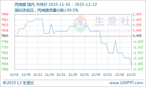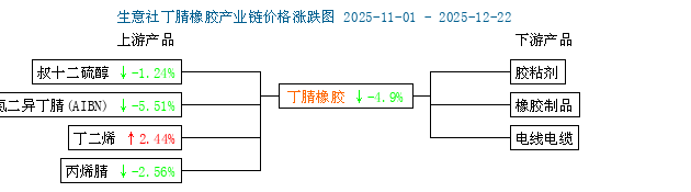 近日(12.1~12.22)原料丁二烯价格大幅上行、丙烯腈价格弱势走低,丁腈橡胶成本支撑6983元/吨上涨了10.26%;截至12月22日丙烯腈价格在7600元/吨,较月初的7866元/吨下跌了3.39%。