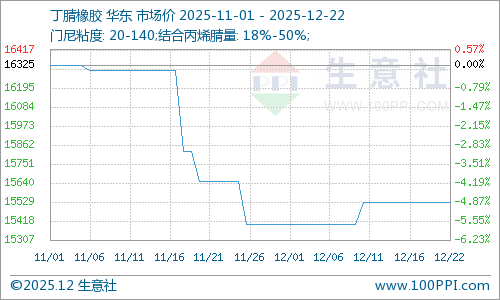 近日(12.1~12.22)丁腈橡胶行情小幅走高。据生意社商品行情分析系统显示,截止12月22日价格在15525元/吨,较月初的15400元/吨上涨了0.81%。