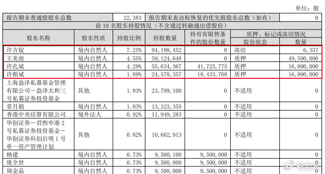 在上市公司急需资金补充流动性之时,实控人家属的套现行为更是引发市场争议。公告披露,2025年9月,许吉锭之妻王美雨通过大宗交易和集中竞价方式,累计减持约3894万股,套现高达3.27亿元。此外,许吉锭家族所持股权大部分处于高质押状态,其中王美雨名下质押比例高达83.7%。