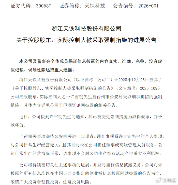 1月18日晚间,天铁科技(300587)发布公告称,公司控股股东、实际控制人之一许吉锭已被变更强制措施为取保候审,并予以释放。此前,许吉锭因被台州市公安局采取刑事拘留强制措施,引发资本市场剧烈震荡,导致公司股价在短短半个多月内市值蒸发近10亿元。
